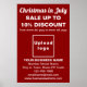 Christmas in July, holiday to celebrate Christmas in the middle of the year. Holiday to advertise also your business. Customisable poster with Christmas in July Sale, your business name and other information. Poster that you can use as marketing material to attract more customers. Customise it and use it to convince more customers to buy your products or clients to like your services this Christmas in July. Design colours and shape are white texts on red background and portrait format rectangle shape. Contents are Christmas in July texts, sale texts, percent discount that you will offer, sale dates, your business name, logo, address, phone number, e-mail and website or your social media page. Please check the appearance after uploading logo and typing texts. If the appearance is pleasing to you, you can place your order now. If you need to resize and move the logo and texts to fit on this poster or on other appropriate size, shape and style that you will choose, please change in the design tool. You can also make other changes in the design tool according to the appearance of this poster that you prefer such as changing the background colour, font colour and font style. Merry Christmas! Wishing you more sales this holiday.
