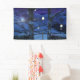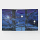 A winter night, looking over a gate flanked by two trees down into a snow-covered glen between rocky hills, filled with little farms and hedgerows and stone walls. A warm glow shines from many windows, Christmas lights sparkle on trees and fences, and a Christmas star beams from the roof of a manor house, all under the rays of a full moon.