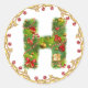 christmas initial H monogram sticker. This exquisite letter H xmas sticker  will give your xmas a traditional touch with a modern personalised feel. Designed to look like a fir tree covered with presents and gifts this letter a on a circular sticker is surounded by a gold frame with red berries. Upmarket and on trend this is an affordable luxury for you holiday decor needs. With  this green and red image on a snowy white background you will be bound to make an impact.  Good for business use also.  Full alphabet available.