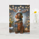 An Irish Setter dog dressed in reindeer antlers, a winter hat, and a cosy scarf poses in a festive setting adorned with Christmas lights and decorated trees