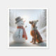 A snowman and an Irish Setter dog both wearing scarves share a moment of companionship in a snowy forest setting