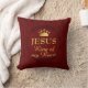Elegant burgundy JESUS KING OF MY HEART Throw Pillow, showing a gold coloured crown and faux gold typography at the centre, inside a deep red wreath. In the background the text says KING OF KINGS in a subtle tiled pattern, which continues on the back. This would make a beautiful addition to your Christmas home decor, and a wonderful, stylish gift throughout the year.