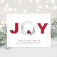 Elegant nature-inspired Christmas holiday postcard featuring the word "JOY" in large red block typography with the "O" depicted by a watercolor illustration of snowy pine trees and a red cardinal bird perched inside. You can personalise the "Happy Holidays" greeting in simple red typography and your name and year underneath.