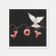 White dove in snowflakes with red and white striped string and Christmas joy text on a black background for a holiday party.