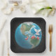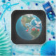 World globe with a white dove flying with red and white striped string with Christmas JOY text on a starry sky.