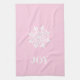 This kitchen towel is shown with a classic Christmas print of a large snowflake with text of JOY.