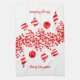 This kitchen towel is shown in white with a lovely strand of red and white ornaments hanging from red berries along with red text of Merry Christmas.