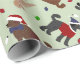 Cute labradoodle dogs dressed in festive holiday outfits, Santa hats and argyle sweaters with scattered Christmas ornaments on a green background.