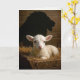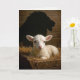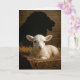 A lamb lies peacefully in a hay-filled wooden trough, casting a shadow that resembles a lion on the brick wall behind it, symbolizing a juxtaposition of innocence and courage.