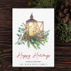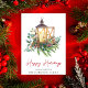 Elegant seasonal greeting card featuring a watercolor illustration of a Christmas candle lantern in an arrangement of seasonal pines, eucalyptus, berries and greenery. "Happy Holidays" is written in a contemporary red script and you can personalise your name in simple modern typography.