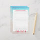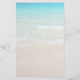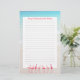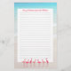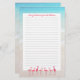 Lined, blank paper with a beach and tropical theme and flamingoes design. Created as a Christmas letter to write family updates to share at the holidays, the paper's background image is a beach with tropical blue water. A row of pink birds decorates the bottom and the same beach scene is on the reverse. Personalise pink text along the top to hold a greeting and family name, or whatever you need.
