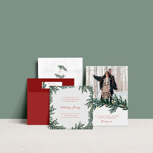 Step into a world of holiday enchantment with this charming Christmas photo card, adorned with a delightful watercolor pine tree branch illuminated by twinkling Christmas lights. The whimsical branch, with its intricate details and warm glow, sets the stage for a truly magical greeting.