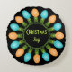 This round pillow with easy to customise text also features a colourful Christmas graphic depicting a circle of festive holiday light bulbs in blue and orange.