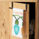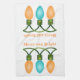 Three colourful holiday light bulbs all in a row are featured in the Christmas graphic decorating this easy to personalise kitchen towel in hues of orange and blue with green cords between.