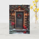 Beautiful Christmas card with an image of a pretty, country log cabin, there is a wreath on the front door decorated with red ornaments, red bow, and poinsettia. Above the door is a pine branch arch with bright Holiday lights. Red lit candles are on the steps along with a pot of red Poinsettias.