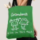 Christmas Love You Grandma Fun Graphic Gift Tote Bag - A practical and personal tote your Grandma will love to use. Choose her favorite nickname and create a thoughtful everyday carry she’ll show off proudly. The tote bags come in two sizes and two design styles — This one is Christmas green to make it a great Holiday gift. The design features cute boy and girl stick-figure characters with arms stretched wide, drawn in a fun whimsical style with simple childlike typography. A clean, bold black-and-white graphic that feels like a child’s own art — sweet, cheerful and full of love.