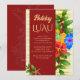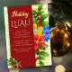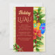 Christmas luau party invitations with hibiscus flowers and holly. Dark red and gold colours with green holly and berries, the flat card contains text templates to easily customise for many events including a holiday office party, tropical birthday, or graduation. The back of the card is also decorated with a hibiscus swag design.