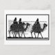 Black and white. Silhouette of the 3 magi on camels with the verses in Matthew referring to them
