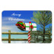 Magnet with my original artwork of an outdoor country scene of a festive mailbox by a wooden fence and pine tree, decorated for Christmas with red and green ribbons, full of colorful Christmas gifts. Text says "Merry Christmas."
