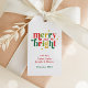 Personalised family Christmas gift tags are a nice personal touch to add to any gift! These holiday gift tags feature colourful modern typography with alternating colours including red, light green, gold, and evergreen. Easily personalised with your family's name and year!