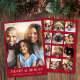 Modern red Christmas holiday greeting card featuring your photo, "Merry & Bright" in elegant white serif typography and your family name and the year in simple white lettering. The back features a year in review photo collage of your favourite people and moments from the past year.