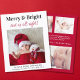 Cute budget-friendly Christmas holiday birth announcement featuring your newborn's photo, "Merry & Bright and up all night!" written in a mix of elegant typography and a stylish red script and your baby's name and birth stats. On the reverse, add three additional photos and a personalised seasonal message.