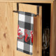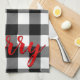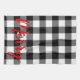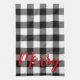 Red "merry" text in a calligraphy font style with Santa Claus hat on black and white buffalo plaid.
