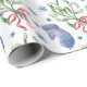 Cute holiday wrapping paper with a snowflake, mistletoe, and mitten pattern in blue, green, and red.