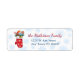 This festive Holiday return address label has an image of a red and white snowflake decorated mitten filled with lots of Christmas goodies, including candy canes, gift packages, an orange slice, and gold bells. Your text is in red and blue at the right side. The image and text are placed on a subtle blue snowflake background.