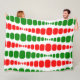 This large fleece blanket has a mid-century modern design of red and green rounded rectangles in increasing and decreasing size running vertically on a field of white.