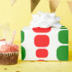 This Christmas wrapping paper has a mid-century modern design of red and green rounded rectangles in increasing and decreasing size running vertically on a field of white.