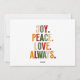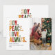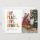 Send heartfelt holiday wishes with this modern Christmas card featuring bold typography in festive colours: “JOY. PEACE. LOVE. ALWAYS.” The clean, minimal layout balances with your family photo, creating a stylish yet warm greeting. Perfect for families who love a simple, contemporary holiday design to share their Christmas spirit with loved ones.