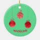 The name is easily replaced with your own to make your own custom ornament gift. On the back is a Christmas baubles on green background.