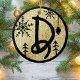 Christmas themed, monogram letter D, in black on a gold glitter background. Black can be modified by clicking on the 'customize further' link. Cute letter D with snowflakes, pine twigs, and a string light bauble.