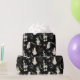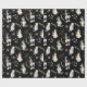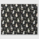 Cute Christmas moose and gnomes skiing on black background with snowflake overlay.