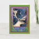 Lovely Christmas design with greens, purple, and dark blue. With Christmas trees at the bottom and a moose in the centre. Splashes of red as part of the frame