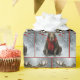 In a snowy forest, a moose sits gracefully, adorned with a bright red scarf and festive red baubles hanging from its antlers