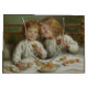 This design features a painting by the English Victorian-era painter Joseph Clark (1834–1926). It shows two young children eating fruit and biscuits on Christmas morning. The girl is smiling at her brother, and the boy is looking at the viewer as his sister watches him lovingly. The young kids are sitting in bed together as they enjoy the festivities of Christmas. There are Christmas crackers on the bedsheets that the children have pulled. There is also a bowl of fruit in front of them. The children both have brown hair and they are both wearing white nightclothes. It is a beautiful depiction of a traditional Christmas celebration in Victorian England.
