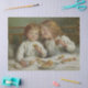 This design features a painting by the English Victorian-era painter Joseph Clark (1834–1926). It shows two young children eating fruit and biscuits on Christmas morning. The girl is smiling at her brother, and the boy is looking at the viewer as his sister watches him lovingly. The young kids are sitting in bed together as they enjoy the festivities of Christmas. There are Christmas crackers on the bedsheets that the children have pulled. There is also a bowl of fruit in front of them. The children both have brown hair and they are both wearing white nightclothes. It is a beautiful depiction of a traditional Christmas celebration in Victorian England.