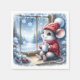 A cosy mouse in a red sweater and hat sits by a frosted window holding a cup of hot cocoa while admiring a snowy landscape with pine trees and snowflakes