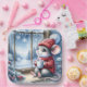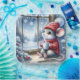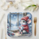 A cosy mouse in a red sweater and hat sits by a frosted window holding a cup of hot cocoa while admiring a snowy landscape with pine trees and snowflakes