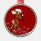 Cute cartoon mouse with a Santa hat on holding a present behind his back. A deep red background with white snow features makes for a very cute, fun and festive Christmas ornament design.