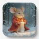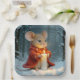 A cute mouse dressed in a red coat holds a lit candle as snow gently falls around it in a wintry forest scene