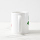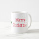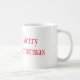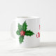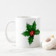 Ceramic coffee mug is shown with a festive Christmas holiday holly art print with Merry Christmas in text.