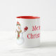 Ceramic coffee mug is shown with a festive Christmas holiday snowman art print with Merry Christmas in text.