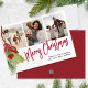 This design features a Christmas happy holidays greenery photo, with a one 1 single picture template, red and green holly berries, a winter greenery foliage botanical leaves, with pine tree branches branch berry, a watercolor red ribbon bow mistletoe, a lovely Christmas holiday photo cards, with a simple minimalist family photo, an elegant classic traditional Christmas, a stylish trendy calligraphy script