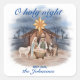 A beautiful watercolor nativity scene with baby Jesus lying in a manger, Mary and Joseph, a donkey and a sheep all in front of the stable.O holy night is across the top and at the bottom is a space to write who the gift is from or a personal message of your choice.