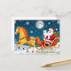 Christmas card featuring a golden red horse with a fiery mane pulling a sleigh with a cute, happy white cat in Santa's arms. Snowdrifts surround the sleigh, and beautiful snowflakes fall from the sky. A silvery moon illuminates the way. Personalized text.