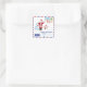 Wrap up your holiday gift with a pretty square seal that features a square envelope with borders in dark blue and red. It has an illustration of Santa Claus in the snow waving near a white tree and a snowman. There’s a small blue label that reads “AIR MAIL PAR AVION “ because all mail from the North Pole is a priority. It must arrive in time for Christmas! This Express Mail envelope has two colourful stamps: in one, there are a snowglobe and Christmas presents, on the other, there’s a Christmas wreath with a yellow bow and red bells. Santa likes to use snail mail. He’s kind of an old-fashioned guy!
