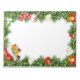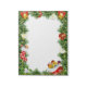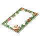Notepad shown in white with a festive holiday ornaments, bells and gifts fir garland frame print.